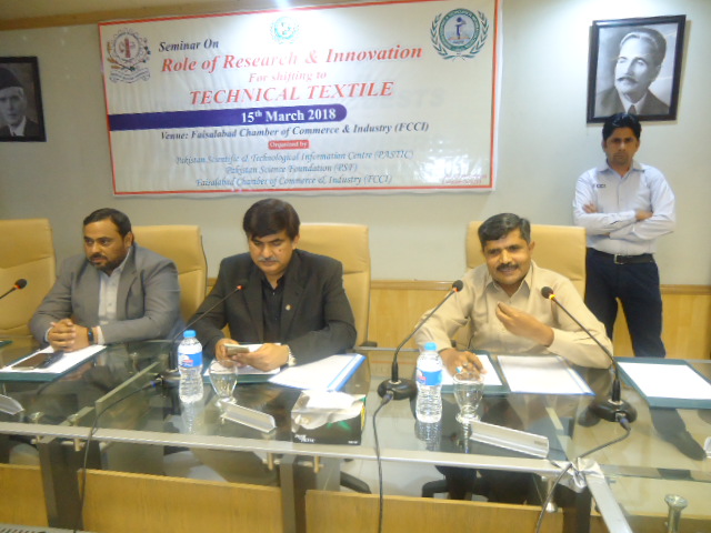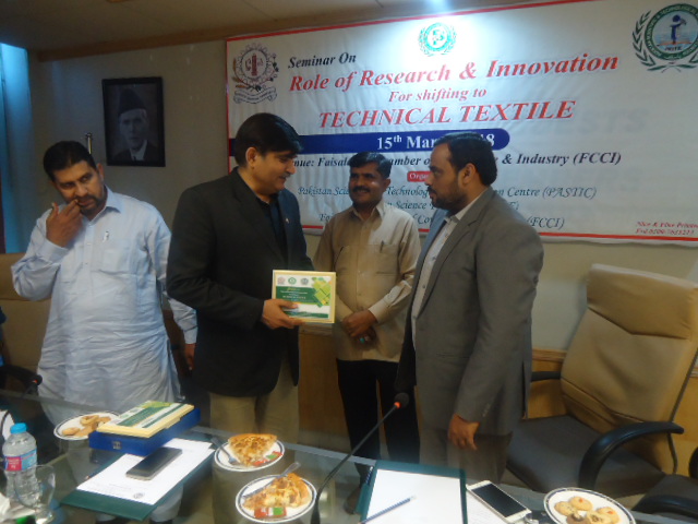 One-DAY Seminar On Role of Research & Innovation For Shifting to TECHNICAL TEXTILE ON March 15, 2018 at Faisalabad Chamber of Commerce Faisalabad was organized by PASTIC Faisalabad and FCCI. Technical Textiles are the high performance purpose built structures having vast range of applications including aerospace, military, marine, medical, construction, geo-textile, transportation and other high-tech applications. Although the textile sector is the backbone of Pakistan’s economy, Pakistan still lags behind in technical textile sector. Whereas technical textiles and value added products have become the fast growing industries. So it is very important to create awareness among the industrialist so that they may contribute to the growth and development of the country in this sector.