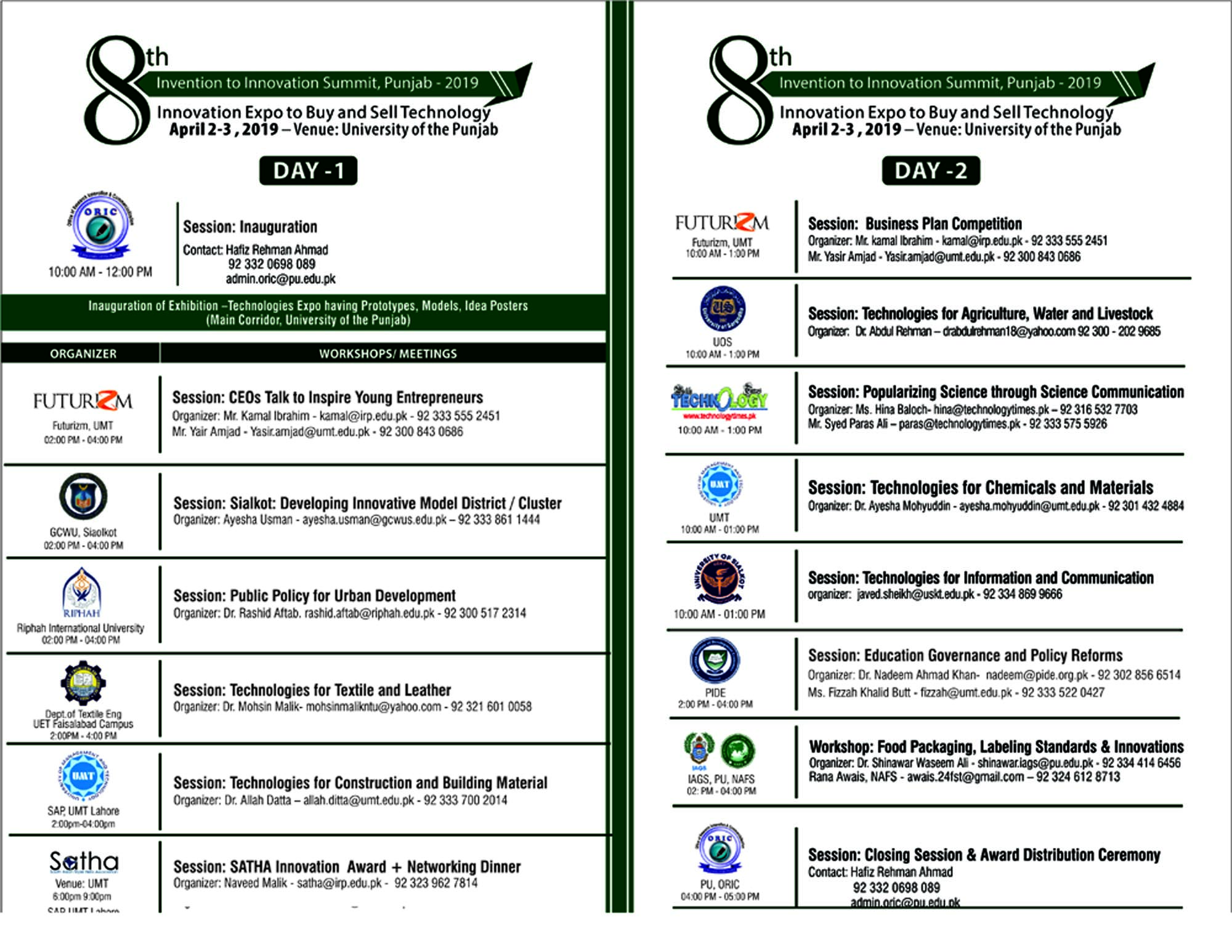 Pakistan Scientific and Technological Information Center (PASTIC)/ Pakistan Science Foundation (PSF) and Institute of Research Promotion (IRP), Lahore in collaboration with ORIC, University of the Punjab, and other prestigious public-private institutions are organizing “8th Invention to Innovation Summit, Punjab-2019,” on 2-3 April, 2019 at University of the Punjab, Lahore.