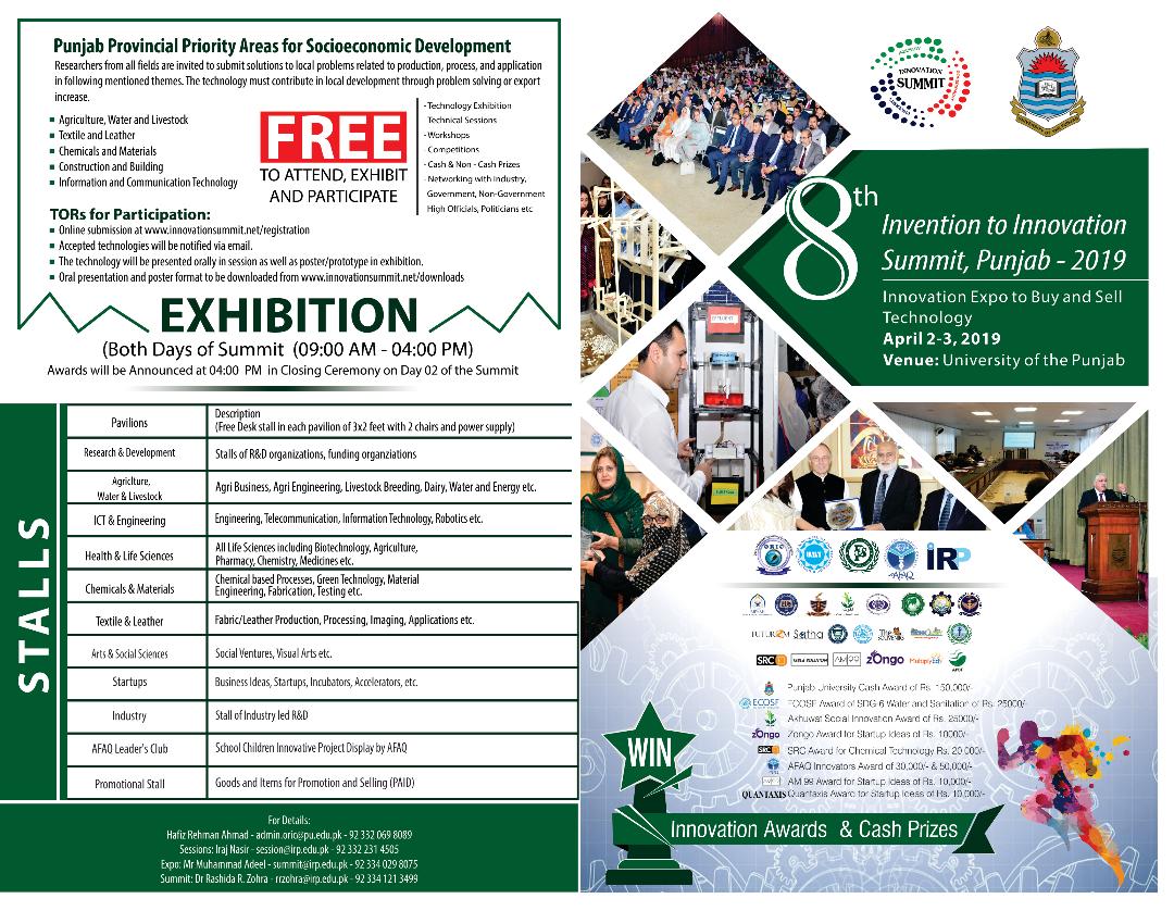 The "Innovation Summits" are hosted annually in all the 04 Provinces of Pakistan to strengthen National R&D network for promotion of S&T based economic development in Pakistan. Each event includes academic and industrial stalls, posters display and technical presentation sessions. Cash awards, appreciation awards and different technology competitions are part of the summits. The event attracts participation of ministers, secretaries, industry CEOs, scientists, funding agencies, students and social activists.